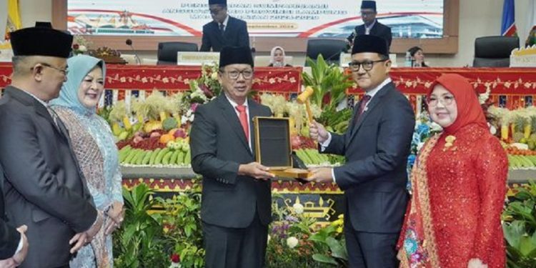 Ketua DPRD Lampung Periode 2019-2024 Mingrum Gumay menyerahkan palu sidang rapat paripurna kepada Pimpinan DPRD Sementara Ahmad Giri Akbar.
